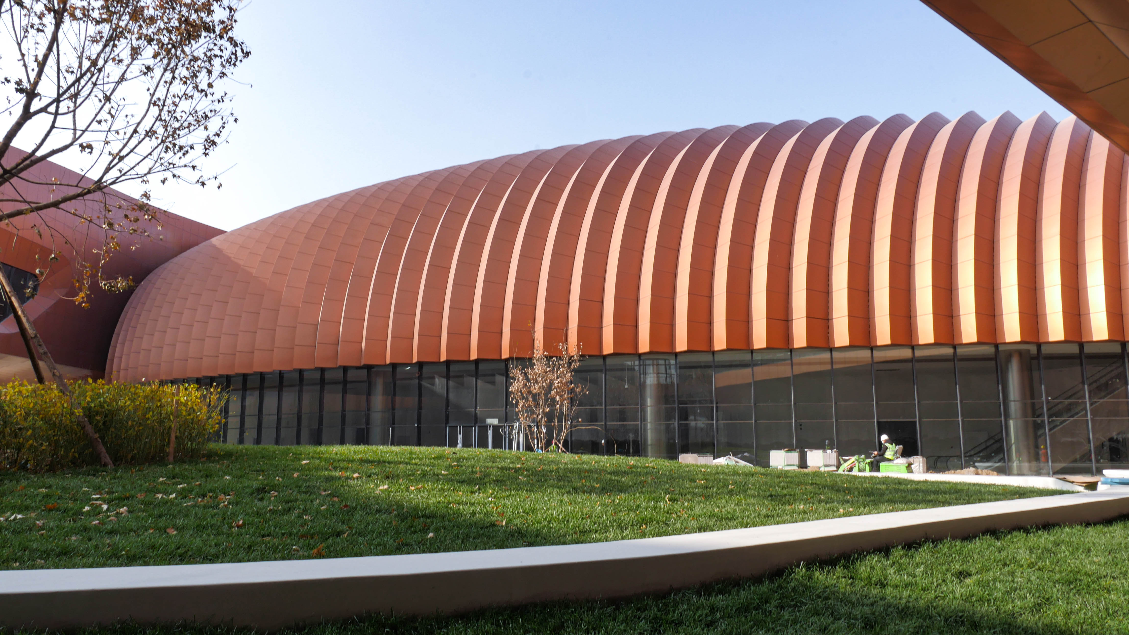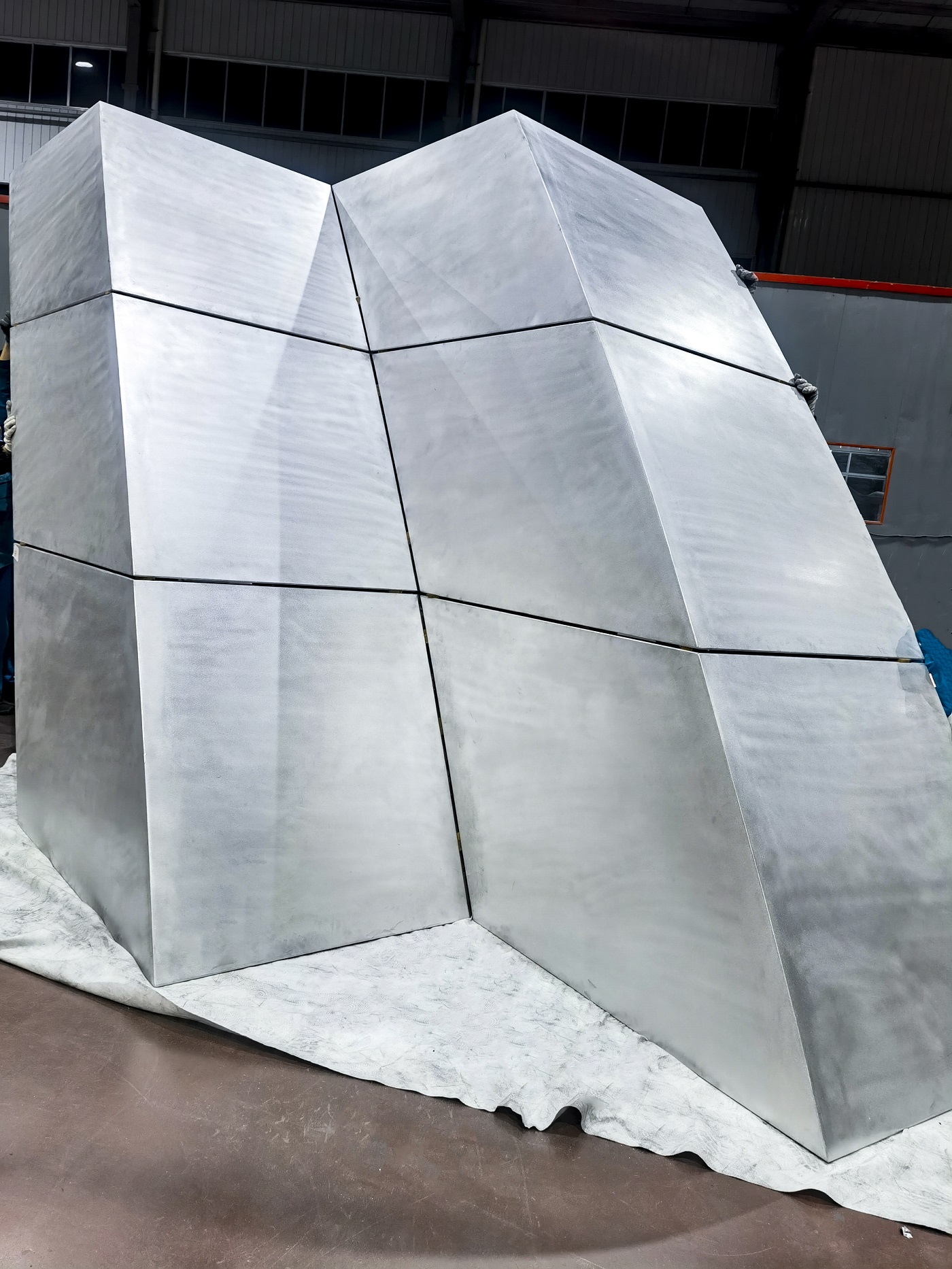 北京新國(guó)展“紫金絲帶”褶皺板,每件板上下、左右角度都有區(qū)別變化,左右呈發(fā)散式布局安裝,上下角度變化2.5度。尺寸偏差不超±1毫米,角度偏差不超過±0.5度,每件板都需專用模標(biāo)尺測(cè)量弧度。